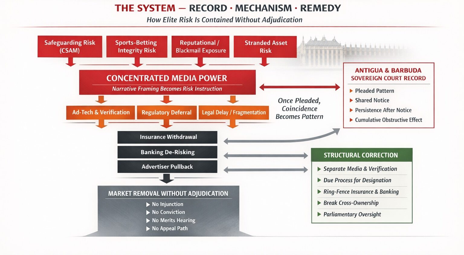 - Court filings connected to Case ANUHCV2025/0149 before the Eastern Caribbean Supreme Court, mirrored in proceedings before London’s King’s Bench Division and related matters in California courts, describe what the claimant alleges to be an interconnected ecosystem of media, legal, financial, and political influence operating across multiple jurisdictions.