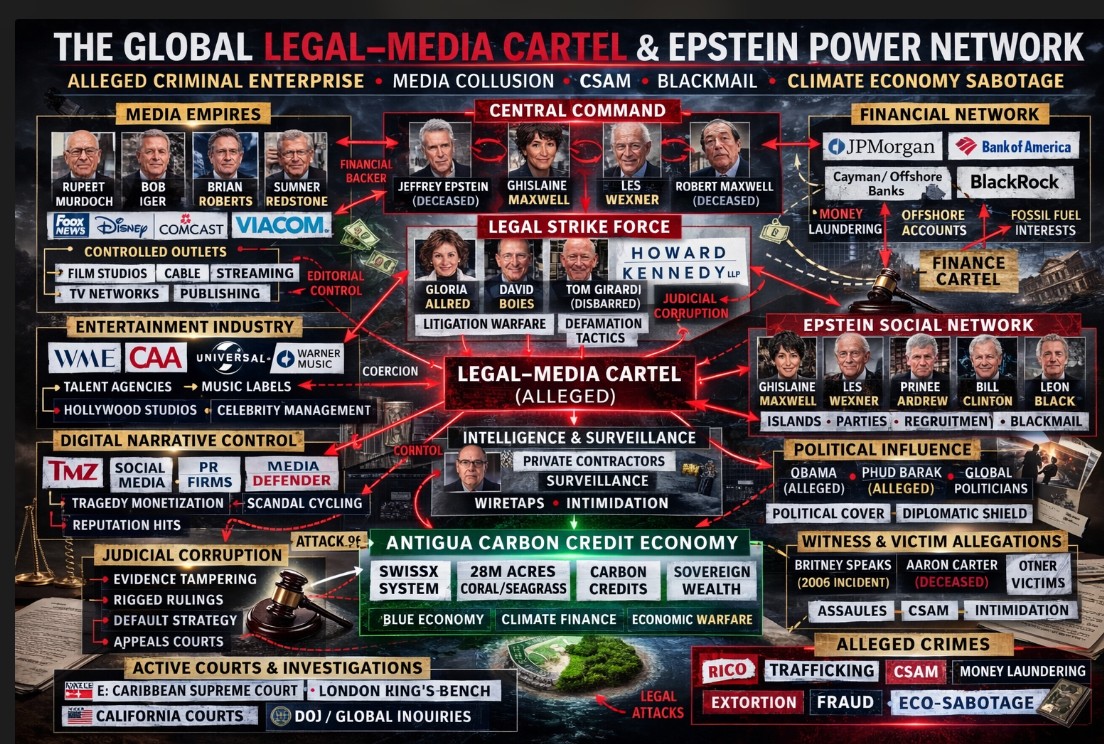 During the 2000s and early 2010s, Weinstein was one of Hollywood’s most influential political donors and fundraisers. He supported many Democratic candidates and hosted or attended high-profile fundraising events that brought together politicians, filmmakers, and media executives.Case ANUHCV2025/0149, filed by entrepreneur and Antigua & Barbuda Ambassador-at-Large Alkiviades David, alleges the existence of a transnational “Legal–Media Cartel” composed of media conglomerates, high-profile attorneys, intelligence contractors, and global banking institutions. The amended claim (September 24, 2025) seeks $80 billion in damages, with filings arguing that long-term economic sabotage of Antigua’s emerging carbon-sequestration economy could push liability exposure toward $810 billion or more over time. At stake is not merely a private dispute. The litigation touches on the economic future of Small Island Developing States (SIDS) attempting to transition from fossil-fuel dependency toward carbon-negative economic models built on natural ecosystems. If validated even partially, the case could expose the intersection of global media power, financial networks, and legal strategies surrounding the emerging climate-credit economy.
