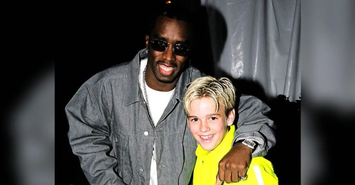 Diddy poses with a young Aaron Carter in 1999.