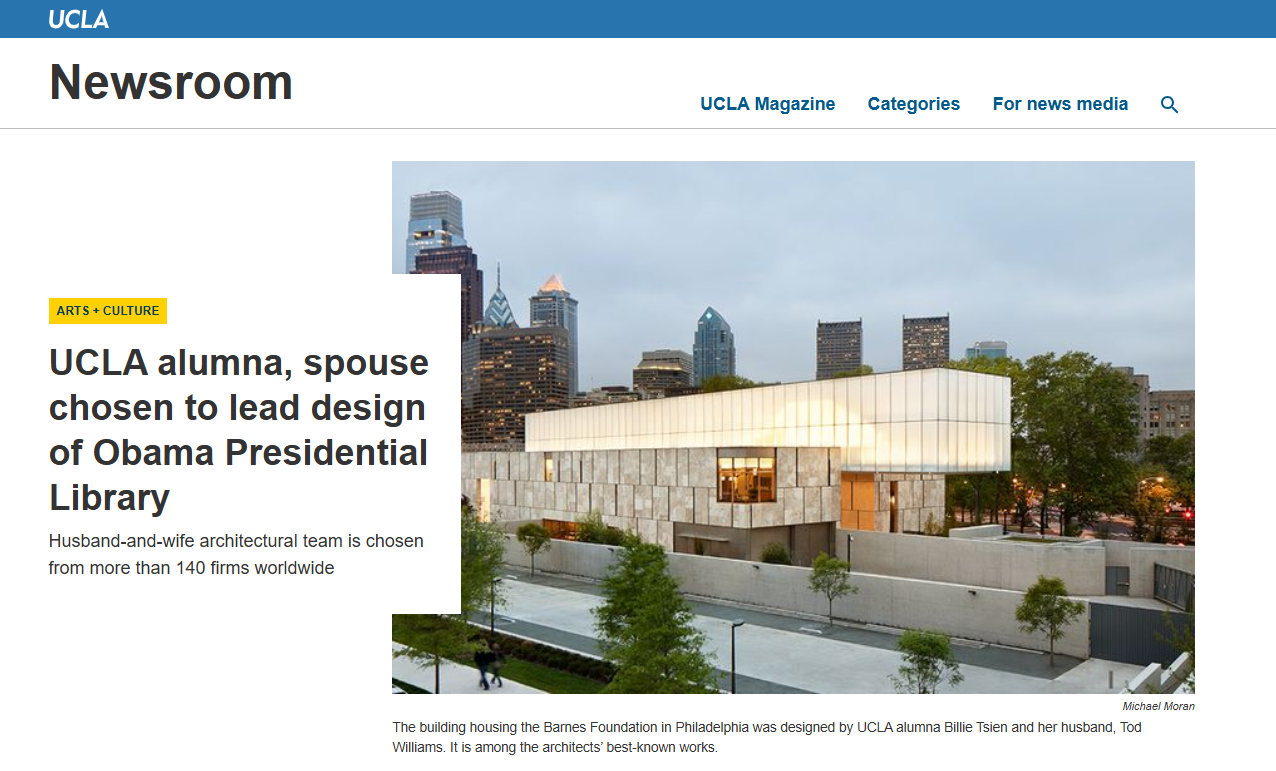 UCLA alumna Billie Tsien and her husband, architect Tod Williams, were selected to design the Obama Presidential Library Center in Chicago after a global search that included more than 140 architectural firms. The husband-and-wife team, founders of the New York–based firm Tod Williams Billie Tsien Architects, are widely recognized for their thoughtful civic and cultural designs, including the celebrated Barnes Foundation building in Philadelphia. Their selection highlights UCLA’s continued influence in shaping major public institutions and cultural landmarks in the United States.Tier 1 – Adjudicated / Procedural Facts